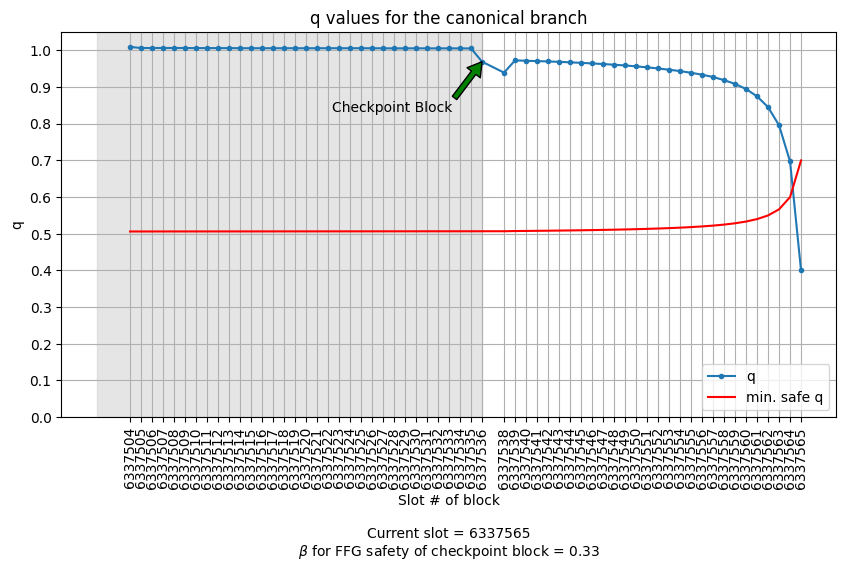 The rule will tell us about the safety of blocks in the current epoch, so focus on the unshaded region to the right of the checkpoint block. The rule computes a $q$ value and a $\textrm{min. safe }q$ value for each block. If the $q$ values of all blocks in a chain is above their $\textrm{min. safe }q$ values, then the head block of that chain is confirmed. In fact, the difference between these values is a measure of the maximum adversarial tolerance that the block achieves. In the figure above, the current slot is 6337565